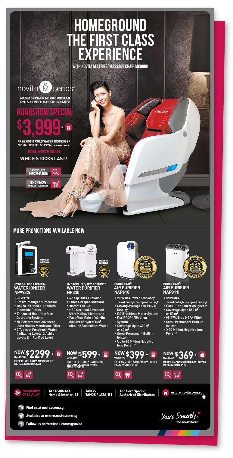 • The above promotions are extended for purchases made on the novita eStore and from novita @ Takashimaya B1 - Home & Interior,